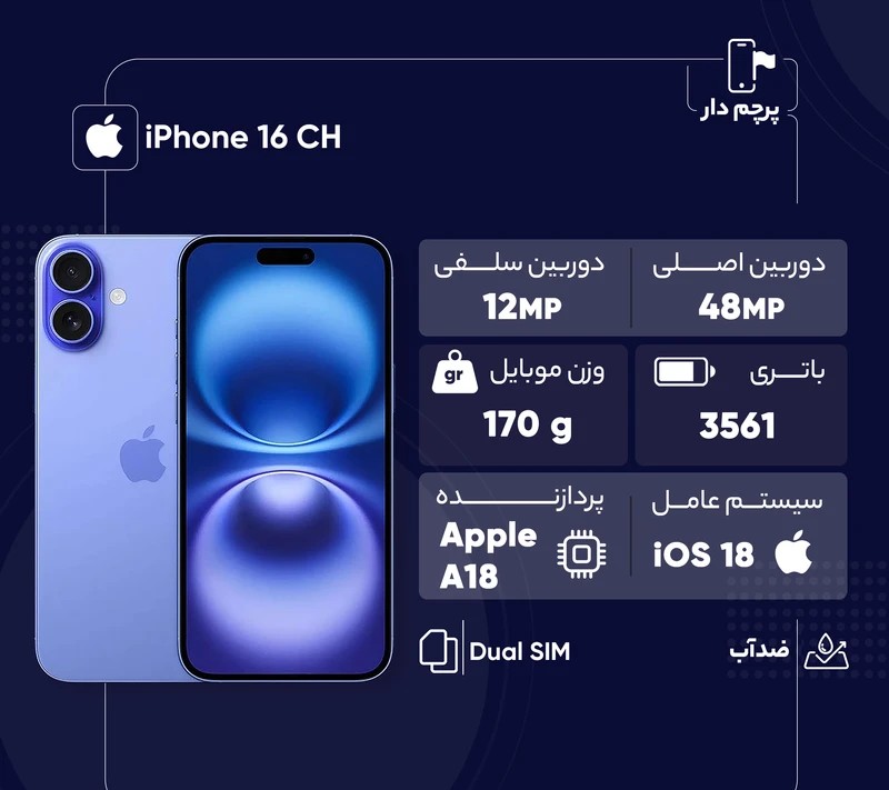 متاسفانه این کالا در حال حاضر موجود نیست. میتوانید از طریق لیست بالای صفحه، از محصولات مشابه این کالا دیدن نمایید.گوشی موبایل اپل مدل iPhone 16، به عنوان یکی از جدیدترین مدلهای این برند معتبر، با طراحی مدرن و ویژگیهای پیشرفته، تجربهای بینظیر از دنیای تکنولوژی را برای کاربران فراهم میکند. این گوشی با ظرفیت 128 گیگابایت و رم 8 گیگابایت، عملکردی سریع و روان را ارائه میدهد که به راحتی از پس کارهای روزمره و multitasking برمیآید. طراحی این دستگاه با دقت و ظرافت بالا انجام شده و بدنه آن از مواد با کیفیت ساخته شده است که حس لوکس بودن را به کاربر منتقل میکند. قابلیت پشتیبانی از دو سیم کارت، امکان استفاده همزمان از دو شماره تلفن را برای کاربران فراهم میکند که این ویژگی بهخصوص برای افرادی که به دو شماره مختلف برای کار و زندگی شخصی نیاز دارند بسیار مفید است. دوربینهای با کیفیت iPhone 16، تجربه عکاسی فوقالعادهای را ارائه میدهند و با فناوریهای نوین، امکان ثبت لحظات خاص با جزئیات بالا را فراهم میکنند. همچنین، باتری با عمر طولانی و قابلیتهای شارژ سریع، این اطمینان را به شما میدهد که میتوانید در طول روز به راحتی از گوشی خودتان استفاده کنید. بهطور کلی، iPhone 16 یک انتخاب عالی برای کسانی است که به دنبال ترکیبی از کیفیت، قدرت و طراحی مدرن هستند. همانطور که میدانید گوشیهای آیفون با پارت نامبرهای مختلفی از جمله CH، ZAA، LLAT ZPAو ... در بازار وجود دارند. پارت نامبر CH مربوط به کشور چین است که تفاوت خاصی با دیگر پارت نامبرها ندارند و تنها در مورد استفاده از تماسهای صوتی و تماسهای گروهی در نرم افزار فیس تایم شامل محدودیت است. این پارت نامبر از دو سیمکارت فیزیکی پشتیبانی میکند که یک نکته مثبت محسوب میشود. این گوشی، مانند تمامی گوشیهای عرضهشده در دیجیکالا، به صورت قانونی و تجاری وارد کشور شده و با رجیستر رسمی، کارت گارانتی معتبر و کد فعالسازی به شما تحویل داده میشود.