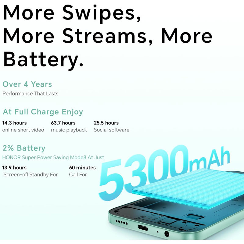 یکی از نقاط قوت اصلی Honor X6c ظرفیت بالای باتری آن است و این موضوع چندسالی میشود که به یکی از خصیصههای اصلی گوشیهای آنر تبدیل شده است. این گوشی به یک باتری ۵۳۰۰ میلیآمپرساعتی مجهز شده که در کنار پردازنده کممصرف و نمایشگر با رزولوشن پایین، میتواند تا یک روز و نیم یا حتی دو روز استفاده عادی را پاسخگو باشد. همچنین پشتیبانی از شارژ سریع ۳۵ واتی به این معناست که شارژ باتری در مدت زمان کوتاهی انجام خواهد شد. این ویژگی بهخصوص برای کاربرانی که وقت زیادی برای شارژ کردن ندارند، بسیار کاربردی است.