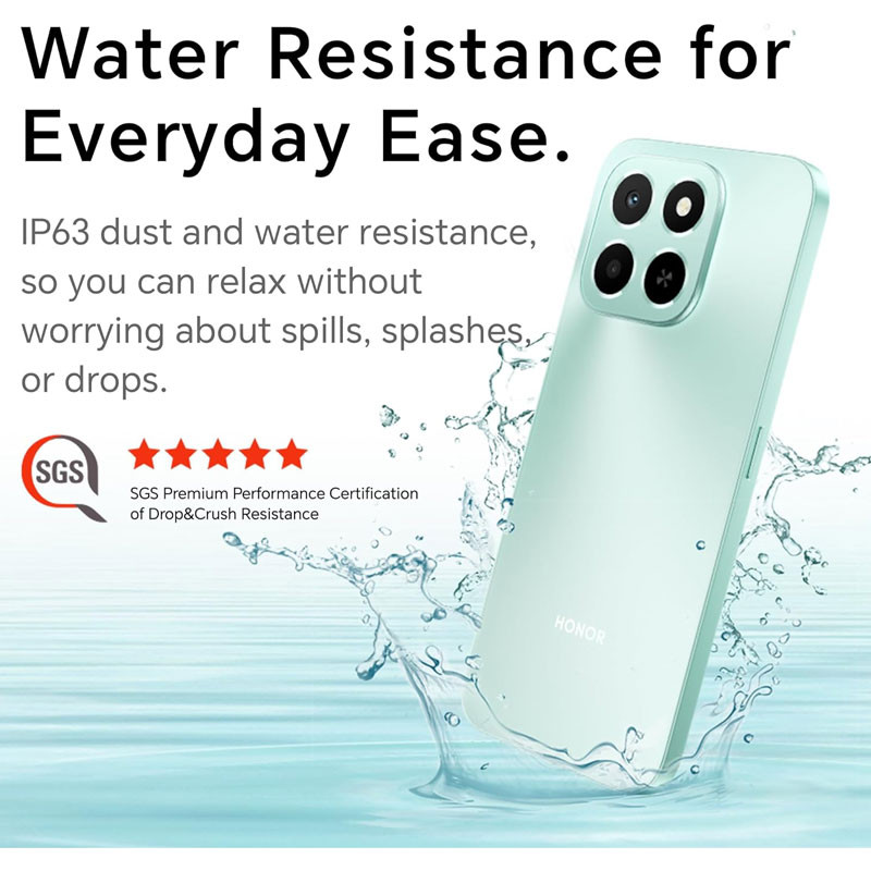 بدنه Honor X6c با ابعاد 164 در 75.6 میلیمتر و ضخامت 8.4 میلیمتر طراحی شده که در کنار وزن ۱۹۹ گرمی، تجربهای متعادل از نظر ارگونومی ارائه میدهد. اما نکته مهم در مورد طراحی این گوشی، مقاومت بالای آن است. این دستگاه موفق به دریافت گواهی IP64 شده که به معنای مقاومت کامل در برابر گرد و غبار و پاشش آب است. علاوه بر این، آنر اعلام کرده که X6c میتواند سقوط از ارتفاع تا ۱.۵ متر را بدون آسیب جدی تحمل کند. چنین ویژگیهایی معمولاً در گوشیهای اقتصادی دیده نمیشود و برای کاربرانی که به دنبال دستگاهی مقاوم برای استفاده در محیطهای سخت هستند، نقطه قوت مهمی به حساب میآید.